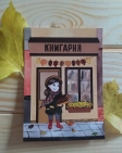 Листівка «Читання. В книгарні» юних цю особливу мить. На ній – дівчина виходить з атмосферної книгарні з новенькими книжечками. Сюжет для тих, хто любить осінь, книги та прогулянки у прохолодні осінні дні.